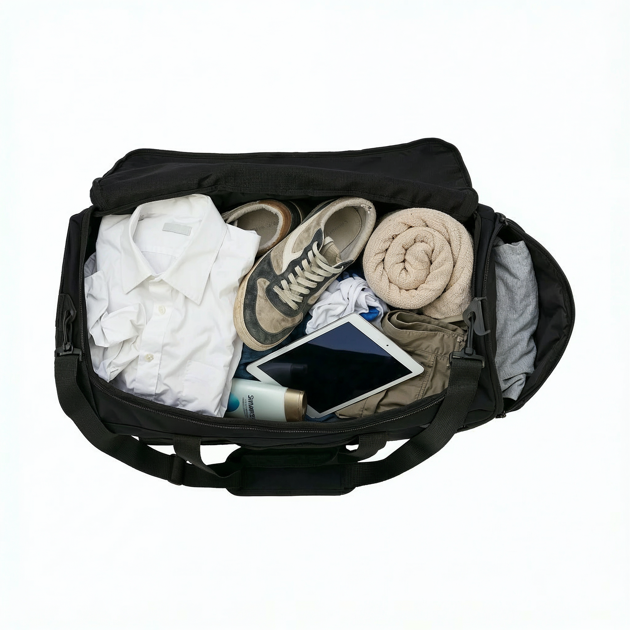 Die Sporttasche für Damen und Herren der Marke BOUM® ist sehr sauber verarbeitet und bietet mit Organizer, Wäschenetz & optional ausziehbarem Schuhfach ein Höchstmaß an Flexibilität und Möglichkeiten, Ordnung ins Gepäck für Kurzurlaube, Trainingsklamotten und ähnliches zu bringen. Vorbei sind, Dank flexibel einsetzbarer Trenner, die Zeiten, in denen alles wild in der Reisetasche durcheinander fällt und man im schlimmsten Fall noch zwischen sauberer und schmutziger Wäsche durcheinander kommt! 🙏🏼Die Trenner müssen nicht alle gleichzeitig eingesetzt werden, wenn man mittig große Kleidungsstücke liegend in der Tasche platzieren möchte. Allerdings empfiehlt es sich, da diese gleichzeitig auch Stabilität für die Tasche bringen und diese damit aufrecht stehen bleibt und beim Tragen nicht durch den Zug des Schultergurtes in der Mitte durch hängt. Die nicht benötigten Trenner können auf dem Boden der Tasche liegend gelagert werden - so bringen sie dann auf dem sonst wabbeligen Boden Stabilität und die Tasche wird so auch zusammengefaltet, liegend in einen ausreichend großen Karton geliefert und kann so wiederum platzsparend aufbewahrt werden.Einer der Trenner, die über Klettverschluss an den Seiten der Tasche fixiert werden, hat zudem eine Hälfte der Druckknöpfe angebracht, deren Gegenstücke an einem mitgelieferten Wäschenetzt angebracht sind, das sich bei Bedarf hier fixieren lässt. Es ist zu klein, um viel mehr als ein T Shirt, eine Boxer und ein paar Socken hineinzustecken, aber mehrere Paar getragene Socken und Slips / Boxer oder Pants passen gut rein. Das Netz kann dann nach der Heimkehr direkt samt getragener Wäsche so in die Waschmaschine, wenn man das möchte. 👍🏻Bei Bedarf hat die Tasche noch ein wirklich praktisches Extragimmick an Bord:Auf einer Seite der Tasche lässt sich ein recht großes Stück Nylonstoff über einen zu öffnenden Reißverschluss "ausklappen" und es entsteht zusätzlicher Stauraum - hier können zum Beispiel ein paar nasser oder zusätzlicher Schuhe verstaut werden. Zur besseren Hygiene und Wahrung der Sauberkeit der Tasche empfiehlt es sich jedoch, diese dann vorher in eine extra Tüte zu stecken.Manchmal ist es im Urlaub aber auch so, dass man mit mehr Kleidungsstücken nach Hause fährt, als man in den Urlaub mitgenommen hat. Aber auch die im Urlaub erstandenen Souvenirs und Mitbringsel finden hier ebenfalls Platz! 👍🏻Die Tasche ist durch eine Gummierung auf der Oberseite wasserabweisend, bietet jede Menge Platz und bringt wirklich Ordnung und System ins Leben. Diese Tasche ist ein organisatorisches Multitalent und für den Preis von rund 40 Euro durchweg zu empfehlen! Zudem sieht sie schlicht und elegant aus und ist einfach nur schwarz, ohne störende Aufdrucke.Von meiner Seite aus gibt's daher volle fünf Sterne und eine ganz klare Kaufempfehlung für jeden, der auf der Suche nach einer neuen Reisetasche ist! 👍🏻